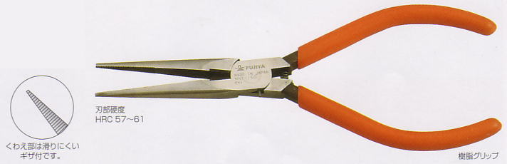 先端が特に細長く、エレクトロニクスス分野で活躍3.peaksマイクロラジオペンチ 150mm(ビニールグリップ・バネ付)MR-150価格: 1,537円レビュー評価: 0.0 レビュー数:0 ◆精密機器・エレクトロニクスなどの分野からの要請で開発された精密作業用の工具です。従来のラジオペンチより先端を特に細く仕上げてあり奥深く狭い複雑な場所での作業に最適です。先端でのくわえ、曲げ作業に耐えるように特殊鋼を使用しています。◆全体に軽く、バネの開きを一定幅以上、開かないようにストッパーピンを付けてあり、長時間の連続作業にも疲労が少なく、快適な作業が出来ます。 呼び寸法 (mm) A (mm) B (mm) C (mm) D (mm) E (mm) F (mm) G (mm) 切断能力 重量 (g) 鉄線 (mm) 銅線 (mm) より線 (mm2) 150 160 51 14 8 2. |